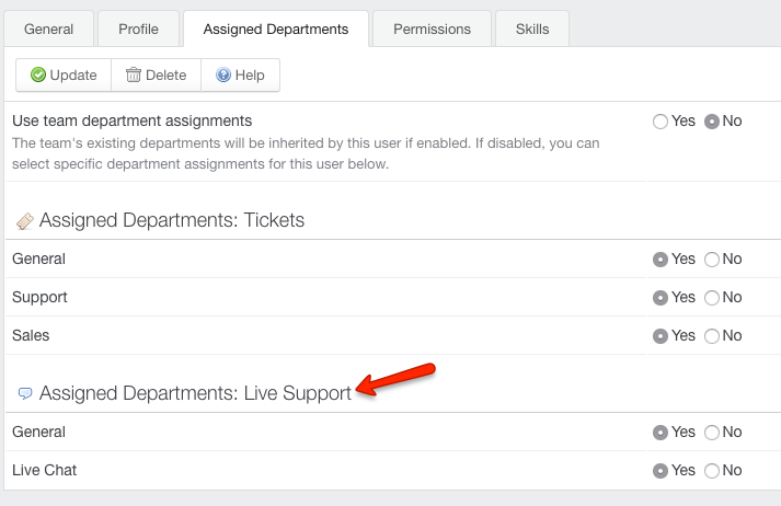 Your staff user account may not be assigned to the 'Live Support' department. You can update this from the admin control panel by editing the 'Assigned Departments' tab for your user account:
